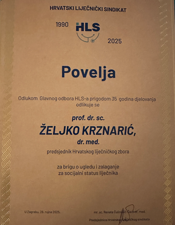 Dana 26. rujna 2025. predsjednik Hrvatskoga liječničkog zbora, prof. dr. sc. Željko Krznarić sudjelovao je na Svečanoj akademiji povodom obilježavanja 35 godina djelovanja Hrvatskoga liječničkog sindikata (HLS-a). Svečanost je održana u petak u 11:00 sati u hotelu Sheraton u Zagrebu. Tom prigodom je predsjednik Hrvatskoga liječničkog zbora, prof. dr. sc. Željko Krznarić, dr.med. odlikovan poveljom Hrvatskoga liječničkog sindikata za brigu o ugledu i zalaganje za socijalni status liječnika.